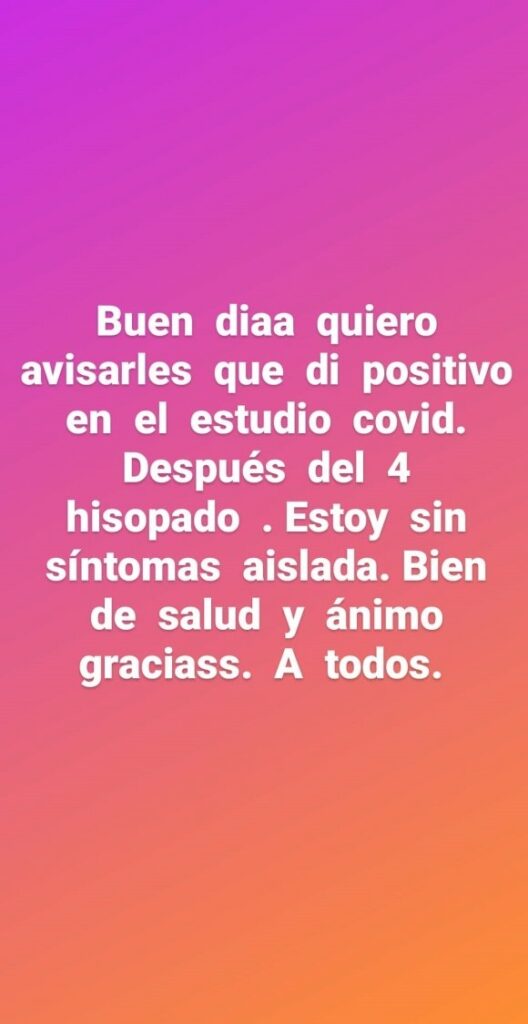 Buen día, quiero avisarles que di positivo en el estudio de Covid. Después del cuarto hisopado. Estoy sin síntomas y aislada. Estoy bien de salud y de ánimo. Gracias a todos», informó Marcela Tauro cursando la enfermedad y el aislamiento en su casa.