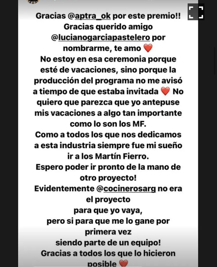 “¡Gracias APTRA por este premio! ¡Gracias Luciano García por nombrarme, te amo! No estoy en esa ceremonia no porque esté de vacaciones, sino porque la producción del programa no me avisó a tiempo que estaba invitada. No quiero que parezca que yo antepuse mis vacaciones a algo tan importante como son los Martín Fierro”, escribió en una historia publicada en su cuenta de Instagram.
